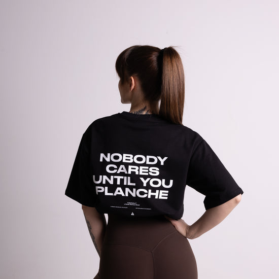 Koszulka oversize z nadrukiem „Nobody cares until you planche” to must-have dla każdego, kto trenuje kalistenikę. Krój oversize zapewnia pełną swobodę ruchów, dzięki czemu świetnie sprawdza się zarówno podczas treningów, jak i na co dzień.